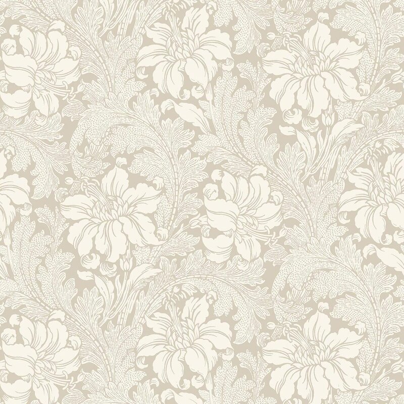 Blommiga tapeten Acanthus har en lång historia. Originalet handtrycktes av Kåbergs redan på 1840-talet. Mönstret trycktes sedan på nytt på 1970-talet, då i tre olika storlekar och 70-talets trendiga färgskala. På 1980-talet kom tapeten i milda pastellfärger. Nu limtrycker vi vackra Acanthus i dovare pasteller på ljusa, neutrala bottnar. Här i en elegant och klassisk beige färgskala. Ett älskat, ornamentliknande tapetmönster som gör sig fantastiskt bra i många olika typer av rum.