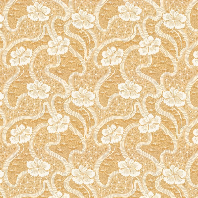 Den guldfärgade versionen av mönstret Tjolöholm har en spännande optik och mönstret upplevs olika beroende av hur ljuset faller in i rummet.